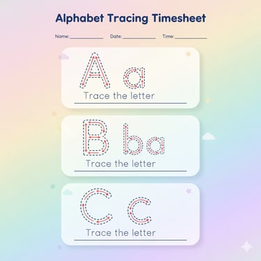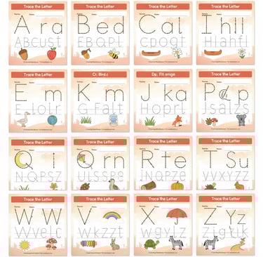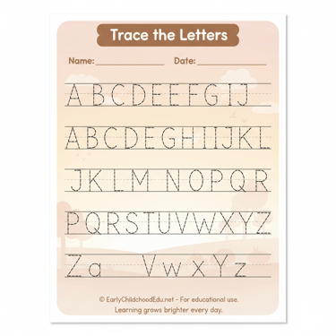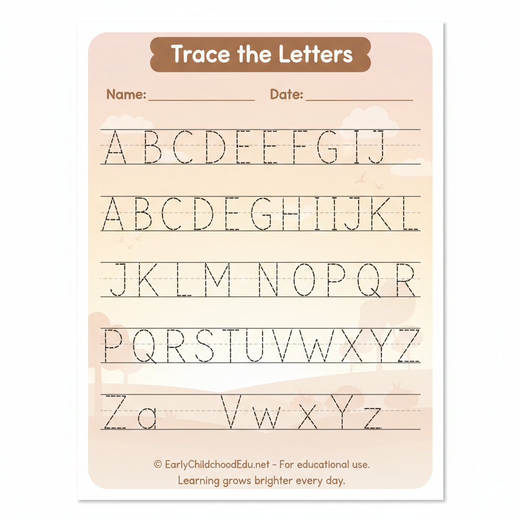Help children with early literacy at home with this alphabet tracing worksheet. Kids can practice A–Z writing with dotted letters, easy pictures and playful pastel colours.